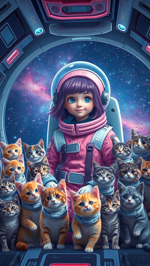 A captivating girl with vibrant purple hair is surrounded by an array of cats of different colors and sizes inside a futuristic space station. She is dressed in a charming pink and purple space suit, while the cats sport tiny, adorable astronaut suits. The backdrop reveals the vastness of space, filled with countless stars and vivid galaxies. The modern, streamlined space station is adorned with advanced mechanical components, creating a whimsical yet cutting-edge atmosphere. Together, the girl and her feline companions embark on a cosmic journey of exploration. The scene is captured in ultra-high-definition, reflecting stunning realism and brilliant cinematic lighting, reminiscent of a 35mm f1.4 shot on Fuji color film, giving the scene a dreamlike, radiant quality.