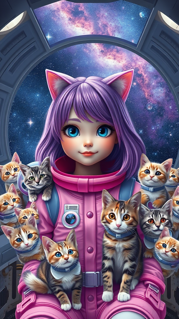 A captivating girl with vibrant violet hair is surrounded by an array of cats in all shapes and sizes, each donning their own miniature astronaut suits, aboard a state-of-the-art space station. She is dressed in an adorable pink and lavender space outfit that complements her colorful locks. The backdrop reveals the infinite expanse of the universe, dotted with countless stars and mesmerizing galaxies. The space station is modern and sleek, with an array of intricate mechanical components visible. This enchanting and futuristic scene captures the essence of adventure as the girl and her feline companions venture through the cosmos together. Photographed in 8k resolution with cinematic lighting, using a 35mm f1.4 lens and Fuji color film, the image is both realistic and radiant, exuding a sense of wonder and exploration.