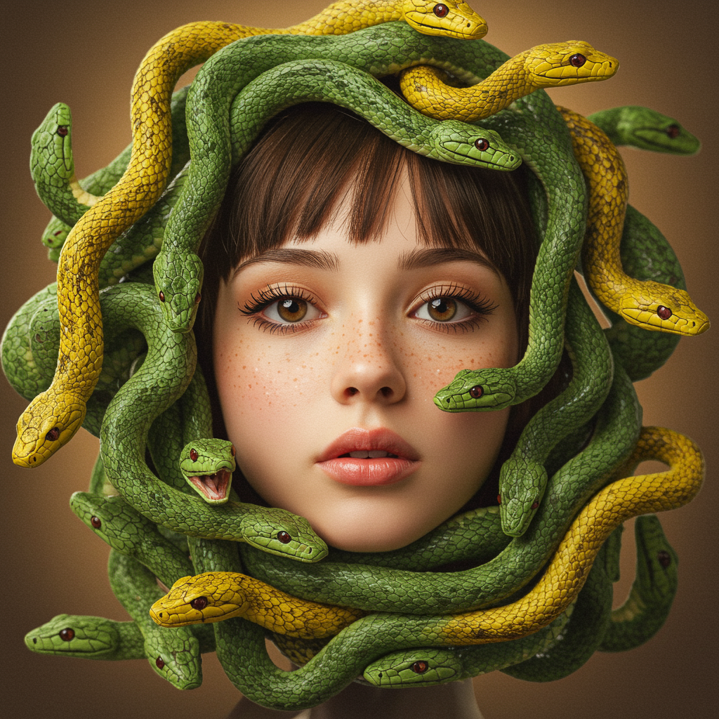 A captivating girl's face emerges surrounded by a mesmerizing tangle of green and yellow snake faces, blending the intricate details of chinapunk and iconic album cover styles. The scene is infused with the soft-focus allure of Luke Fildes, bathed in a warm palette of light amber and silver. The exotic and enchanting lighting creates an otherworldly aura, drawing the viewer into a surreal realm.