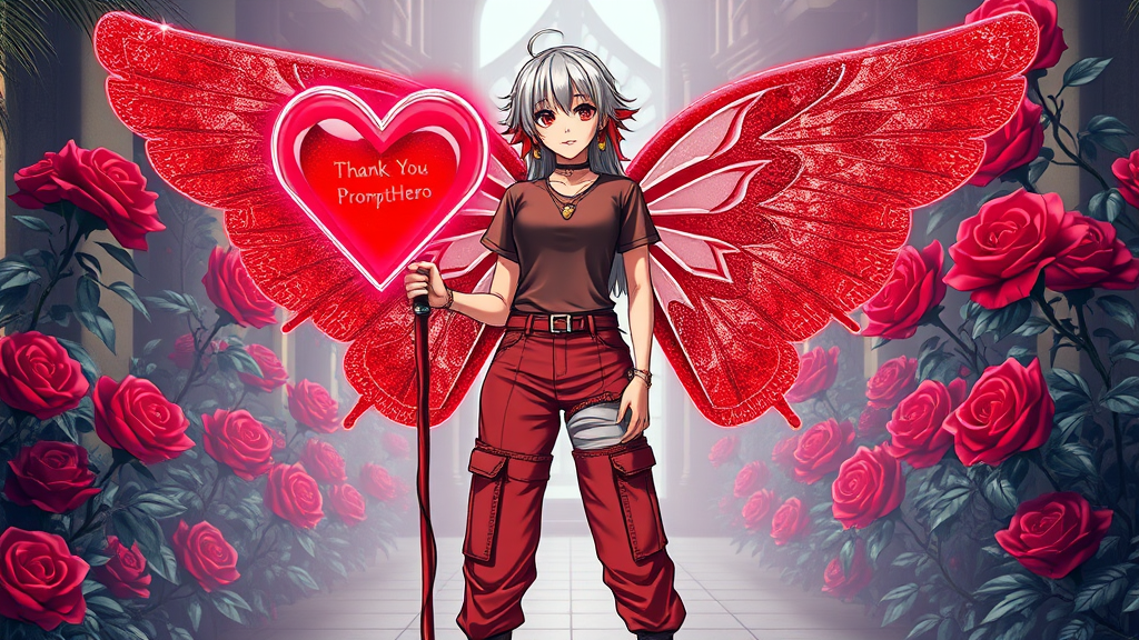 A captivating gothic anime woman with striking silver and ruby-red hair stands in a stunning Egyptian-inspired garden. She wears a modest professional Gala T-shirt paired with red and white cargo pants, highlighting her athletic elegance. Casually holding a large neon-outlined heart-shaped staff with "Thank You PromptHero" emblazoned across it, she stands confidently with her legs slightly apart at a 45-degree angle. Her gaze is alluring with oversized heart earrings and a ruby-diamond heart pendant necklace adding a touch of elegance. Her enchanting neon ruby-red and silver glittery glassy butterfly wings further enhance her allure. Behind her, the opulent garden blooms with vibrant neon black roses crafted from ruby glass, creating a luxurious atmosphere in this mesmerizing illustration, embodying Phoenix Mode inspiration with subtle creative modifications.
