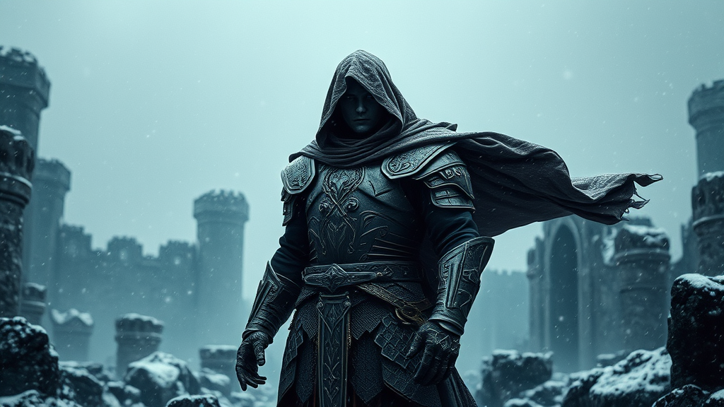 A captivating half-body portrait featuring a fearsome warrior clad in intricate armor, embodying a legendary and spectral presence, with a tattered cloak flowing around them. The faceless figure stands solitary amidst ancient ruins, enveloped by a swirling snowstorm. The composition exudes brutality and epic grandeur, capturing the viewer with its breathtaking digital artistry inspired by Eugene de Blaas and Ross Tran. Dramatic lighting casts a gloomy, mist-laden atmosphere, creating a calm yet eerie elegance. The scene echoes romanticism with a cinematic flair reminiscent of Greg Rutkowski's works, exuding an unforgettable high quality. Despite an impression of low quality with elements of blurriness, plastic texture, and graininess, intentional distortions enhance the mystical feel. The portrayal breaks traditional anatomy rules, offering abstract limb proportions that evoke a sense of the supernatural, free from any text, trademarks, or distinctive markings.