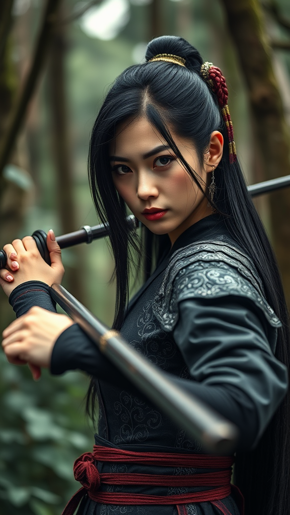 A captivating half-body portrait of a legendary Fu Hao assassin poised in a dense woodland setting, her long, sleek black hair cascading over her shoulders, accentuating her light fair complexion. Adorned in finely detailed battle gear, each element showcases intricate patterns with historical essence, and she brandishes a meticulously crafted weapon indicative of her masterful skill. The mood captures photorealistic and cinematic qualities under the soft, diffused light of an overcast day, with an 8k hyperrealistic focus. The ambient lighting casts a natural, ethereal glow around her, immersing the viewer in an ancient world expertly rendered through octane techniques, preserving the essence of her enigmatic and formidable presence.