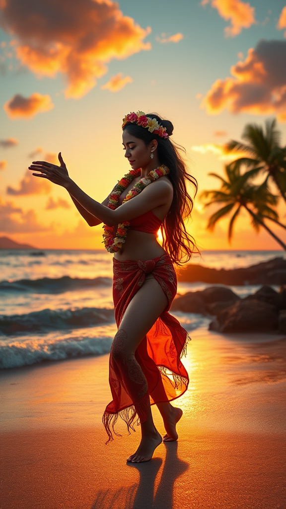 A captivating Hawaiian hula dancer gracefully moves on a serene tropical beach at sunset, with the calming ocean waves in the background. The scene is painted in a photorealistic oil style, reminiscent of Studio Ghibli's enchantment and Robert Wyland's mastery of marine life. The dramatic lighting casts a magical glow over the dancer, highlighting the delicate flowers in her lei and the intricate patterns of her traditional attire. This hyper-realistic and highly detailed artwork, captured with a 50mm lens, evokes a sense of dreamlike tranquility and cinematic wonder.