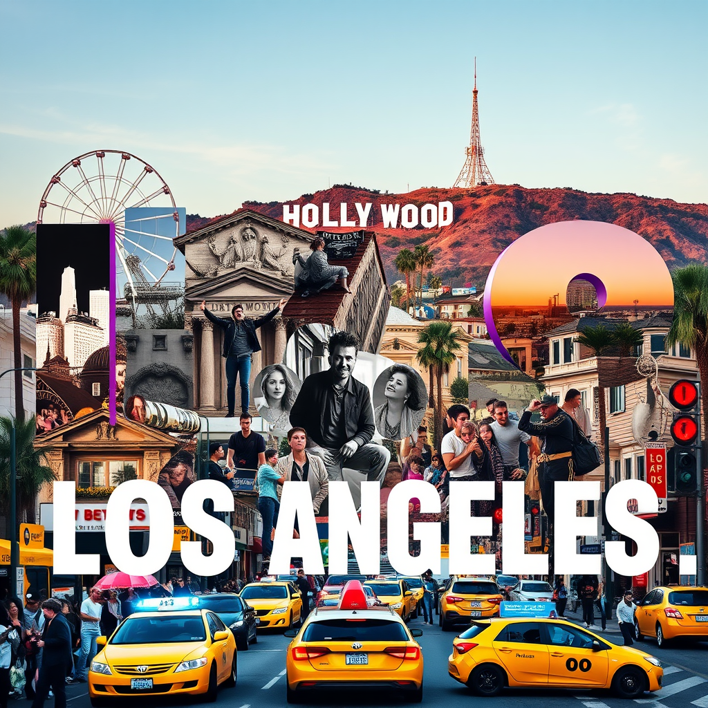 A captivating, high-contrast cinematic photo-style vertical collage capturing the vibrant essence of Los Angeles. The letters of 'Los Angeles' are represented by dynamic, lively scenes, featuring iconic landmarks and moments. The Santa Monica Pier and Hollywood Sign dominate the backdrop, while scenes of bustling street life, yellow cabs, and energetic people fill the foreground. The atmosphere is electric and spirited, emphasizing the city's dynamic energy. Bold, eye-catching typography enhances the collage, creating a stunning visual tapestry of Los Angeles.