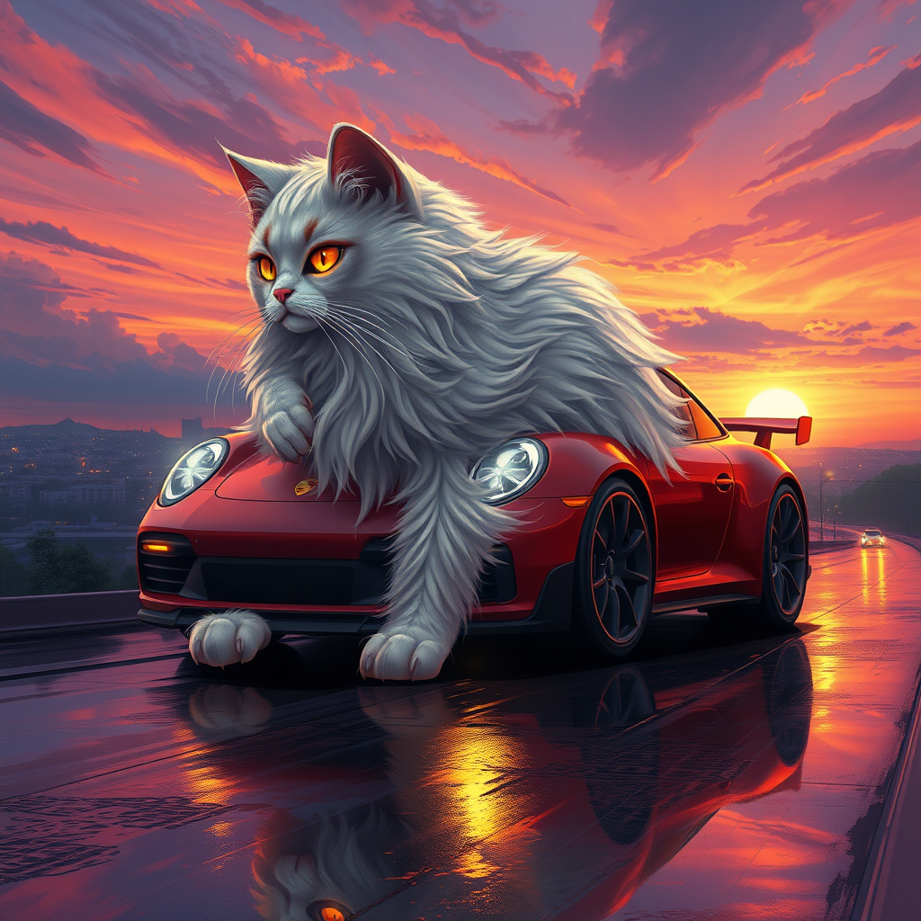 A captivating hybrid creature merges the grace of an Angora cat with the streamlined allure of a Porsche 911. This extraordinary being features a feline form with sumptuous, flowing fur that seamlessly integrates with sleek automotive elements, such as lustrous metallic sheens, smooth curves, and eyes that resemble glowing LED headlights. Its paws are an exquisite fusion of organic and mechanical, resembling finely crafted wheels with delicate yet robust components. Set against a mesmerizing animated landscape at twilight, the sky is an enchanting swirl of deep purples and vivid oranges, the sunset casting a warm glow over intricate city lights that shimmer on glistening rain-slicked streets. The perspective draws the viewer toward a distant horizon, rendered in a digital painting style rich with color and dynamic brushstrokes, evoking an atmosphere of awe and serene contemplation reminiscent of Makoto Shinkai's work.