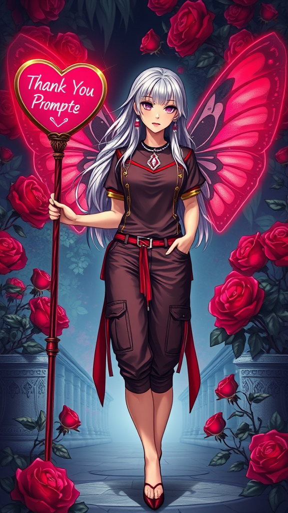 A captivating illustration depicts a gothic anime woman with striking silver and crimson-red hair, showcasing a stunning Egyptian allure within an enchanting garden setting. Her attire combines a stylish, modest professional Gala T-shirt with a cargo pant dress, predominantly featuring red and white accents that highlight her athletic, well-defined beauty. She stands confidently, one leg slightly forward, casually holding a large neon heart-shaped sign-staff emblazoned with "Thank You PromptHero." Her enchanting gaze captures the viewer's attention as her ruby-diamond heart pendant necklace and large heart earrings exude sophistication. Adding to her magical presence are her mesmerizing neon ruby-red and silver glittery glassy butterfly wings. The background is an opulent garden, filled with dazzling neon black and ruby glass roses, creating an atmosphere of luxurious elegance.