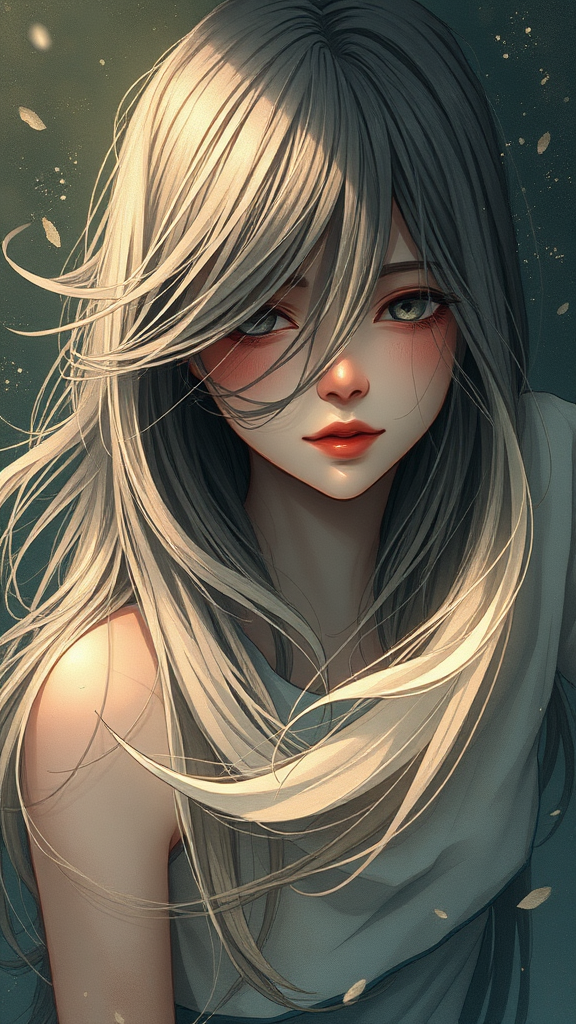 A captivating illustration featuring a girl with long, flowing hair cascading over and obscuring her face, rendered in a style reminiscent of Oliver Wetter and Paul Hedley with a touch of wavy, abstraction influenced by the Mono-ha art movement. The composition is in high resolution with intriguing subtle textures and ethereal lighting. The scene evokes a dreamlike atmosphere, and the girl is surrounded by delicate, swirling elements that add to the sense of movement and mystery, maintaining a balance between stillness and dynamism.