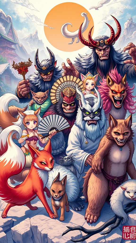 A captivating illustration featuring a group of mythical characters in intricate detail: a graceful Kitsune with multiple tails swirling elegantly, a mysterious Nekomata with its split tail curled playfully, a fierce Tengu brandishing a fan and exuding an air of authority, a formidable Oni with menacing horns and a powerful stance, a mischievous Tanuki with an impish grin, a serene Yuki-Onna enveloped in an aura of icy calm, a cunning Jorogumo with delicate spiderweb patterns, a wild Yama-Oroshi with untamed hair and sharp features, and a whimsical Kijimuna with a childlike exuberance. Behind them unfolds the fantastical world of Funji, a rich tapestry of vibrant landscapes and enigmatic structures. The scene bursts with the dynamic energy and detailed artistry of manga style rendered in HD, capturing every nuance and expression in stunning 2K resolution. While staying true to the magical essence of these characters, the scene incorporates unexpected touches—a Kitsune's tail emitting a subtle ethereal glow, or the Tengu's outfit imbued with modern elements—infusing the classic imagery with a fresh perspective.