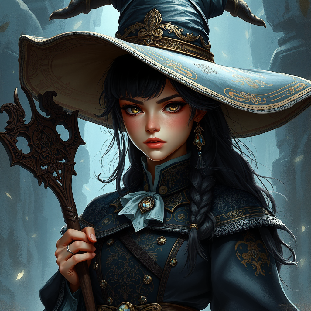 A captivating illustration of a fiercely independent young witch, dressed in an ornate magic school uniform, complete with intricate patterns and embellishments. Her large, wide-brimmed witch hat adds an air of mystery and authority. The scene is cinematic, with a stunning backdrop that enhances her rugged charm. The digital painting is a masterpiece, showcasing elaborate details and elegant artistry, capturing the essence of sophisticated concept art. This striking piece is trending on platforms like ArtStation and Pixiv, drawing admiration for its creativity and craftsmanship.