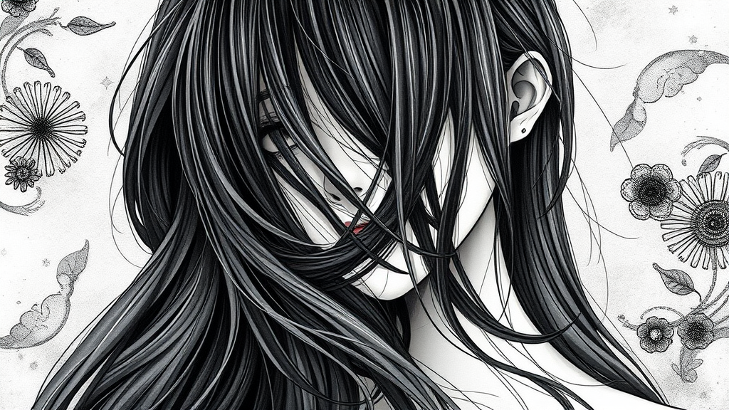 A captivating illustration of a girl with cascading long hair obscuring her face, designed in a style reminiscent of Oliver Wetter and Paul Hedley, featuring fluid, wavy elements characteristic of the Mono-ha movement. The artwork is high resolution, emphasizing delicate textures and subtle monochromatic tones, creating a harmonious blend of realism and abstraction. The composition holds a unique balance, with imaginative touches that evoke mystery and grace, while retaining the essence of the original vision.