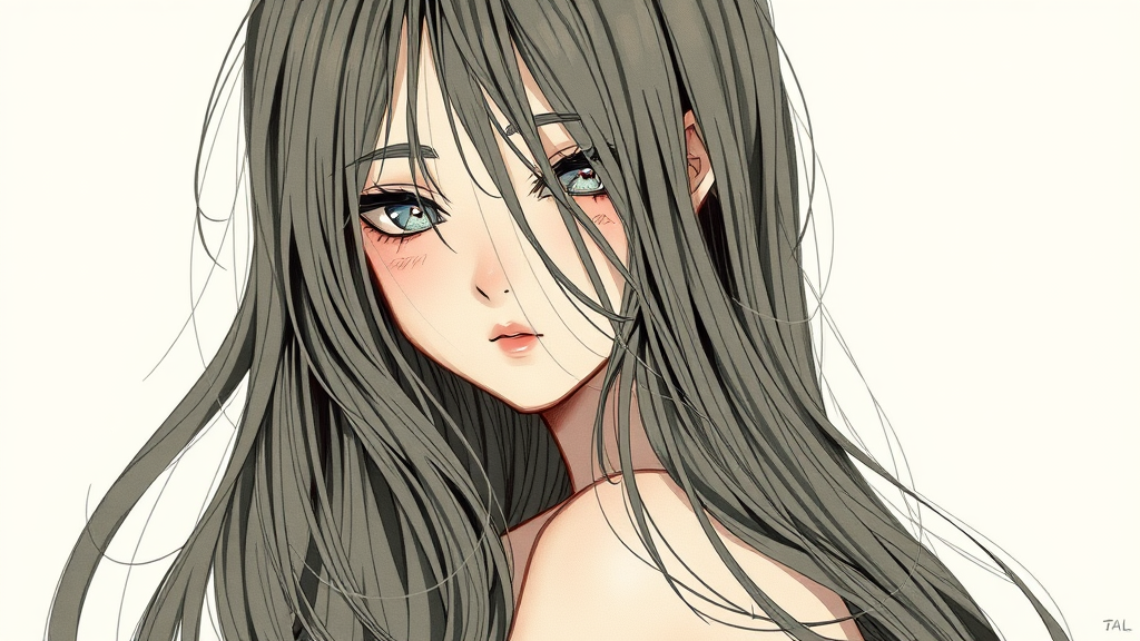 A captivating illustration of a girl with long hair cascading over her face, reminiscent of Oliver Wetter and Paul Hedley’s styles, embodying a fluid and wavy aesthetic. The piece captures the essence of Mono-ha, focusing on simplicity and natural beauty, with a high-resolution finish. Subtle modifications reveal hints of graceful movement in the hair, adding an ethereal touch and a serene, dreamlike atmosphere, set in a slightly abstract background that complements the figure harmoniously.