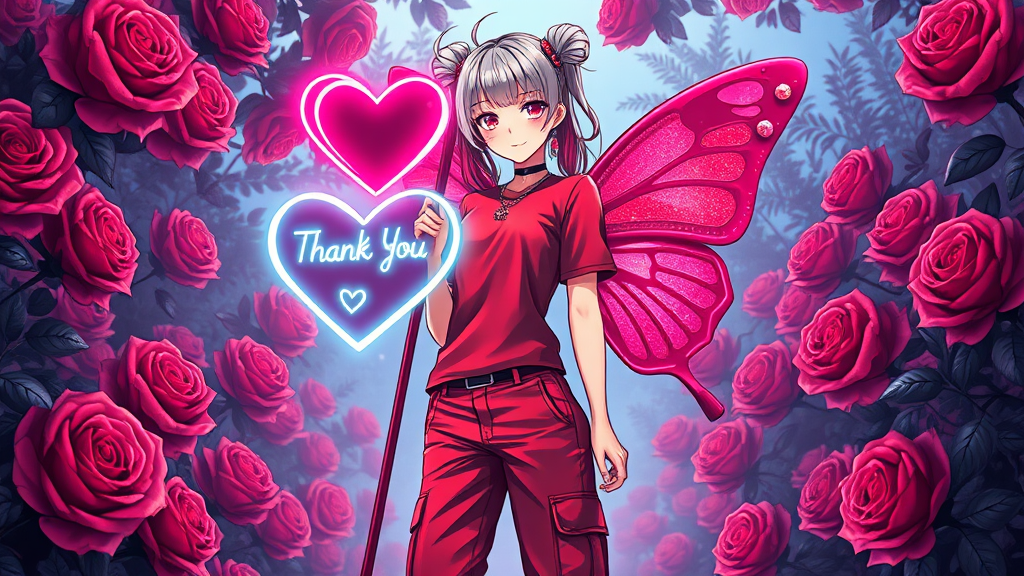 A captivating illustration of a gothic anime woman with striking silver and ruby-red hair, dressed in a modest yet professional Gala T-shirt and cargo pant dress attire in red and white hues, highlights her athletic beauty. She stands confidently, holding a large neon outline logo heart-shaped sign-staff with "Thank You PromptHero" written on it, her legs slightly apart at a 45-degree angle. Her gaze is magnetic, enhanced by a ruby-diamond heart pendant necklace and oversized heart earrings that exude elegance. The woman features enchanting neon ruby-red and silver glittery glassy butterfly wings, enhancing her mesmerizing appeal. The opulent garden backdrop is filled with vibrant neon black ruby glass roses, creating a stunning atmosphere of luxury.