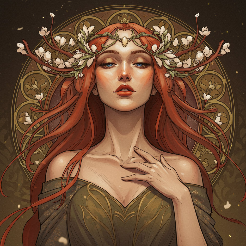 A captivating illustration of a woman, blending video montage aesthetics with nature-inspired Art Nouveau elements, showcasing soft-focus and ethereal beauty. The piece features minimalist sketches and elegant curves, brought to life with free and expressive brushwork, evoking a profound sense of awe. The design maintains a 73:128 aspect ratio and a high degree of stylization, enhancing its dreamlike and serene quality.