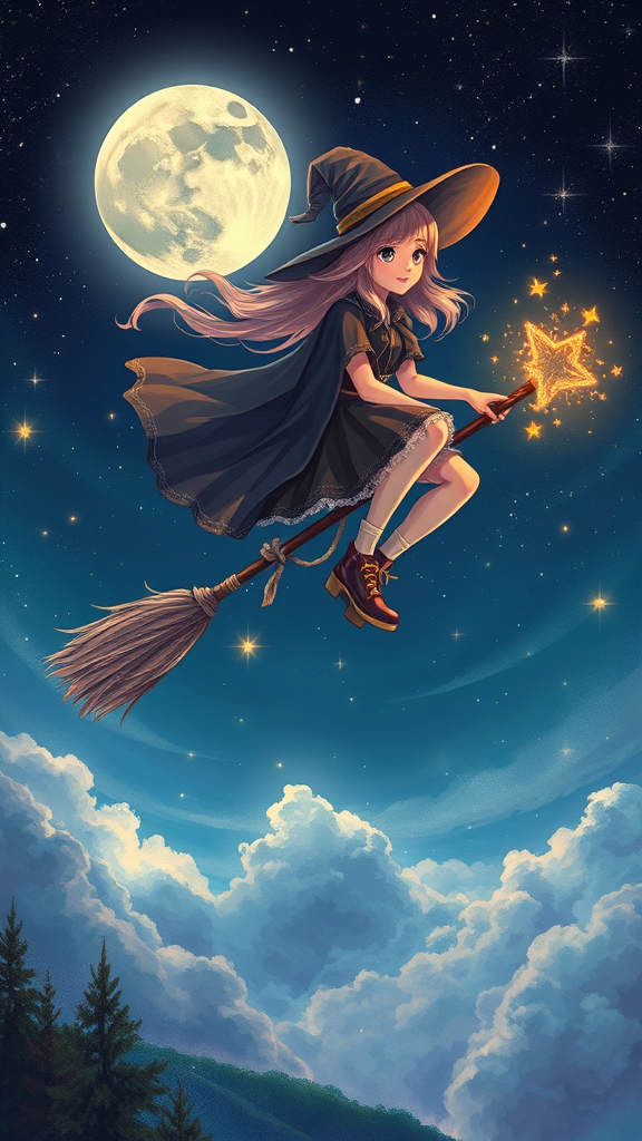 A captivating illustration of a young witch soaring through the night sky on her broomstick, enveloped by the ethereal glow of moonlight and sprinkled with twinkling stars. Her long hair and flowing cape dance with the wind, while her wide-brimmed hat sits slightly askew, adding a touch of whimsy to her adventurous spirit. Below, the clouds part to reveal glimpses of a magical landscape, filled with whispers of myths and legends. The witch's boots gleam as she navigates the air with both grace and determination, casting spells that shimmer and ripple around her. The scene captures a sense of playful freedom and boundless imagination, blending realism with enchanting fantasy elements. The composition elegantly transitions from an engaging foreground, through a vivid middle ground, to a dreamy background, each layer rich with color, texture, and detail. This enchanting piece harmoniously touches upon themes of beauty, fantasy culture, and the timeless tales of witches and magical worlds, inviting viewers to lose themselves in a realm of wonder and imagination.