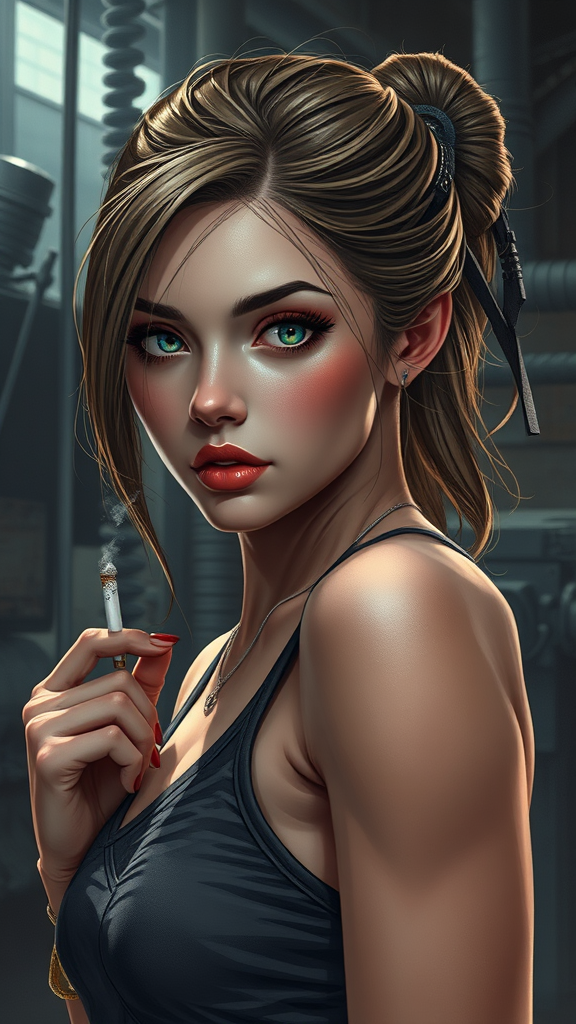 A captivating illustration of a young woman in a rugged industrial environment, exuding strength and beauty. She stands confidently, a cigarette casually in hand, her presence commanding the scene. Her soft, lustrous features are captured in exquisite detail, from the intricate design of her iris to the realistic texture of her skin pores. The lighting is dark and dramatic, casting heavy shadows that enhance the depth of her expression. The setting is a fantastical blend of the real world and imagination, filled with mechanical elements and a sense of motion. This full-body 8k render showcases her in an action shot, with a focus on her detailed face and the intense atmosphere surrounding her. The artwork is a digital painting that features smooth lines and sharp focus, inspired by the styles of Artgerm, WLOP, and Ilya Kuvshinov. It combines the craftsmanship of concept art with the high-quality execution of an octane render, as one might find on ArtStation.