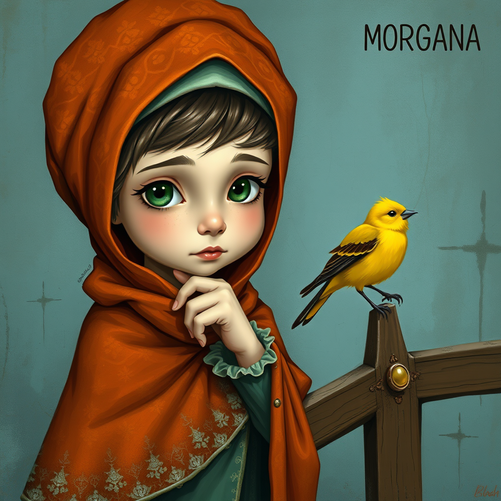 A captivating illustration portrays a young girl with gentle features and striking green eyes, adorned with a richly patterned, deep-orange headscarf and a matching cloak that appears cracked like vintage pottery. She rests her chin thoughtfully on her hand, as she gazes at a lively yellow bird perched on a rustic wooden railing. The background features a subtly artistic, dusky blue wall with washed-out, abstract designs reminiscent of an ancient fresco. The scene radiates an air of whimsy, nostalgia, and fantasy, with intricate details and a soft, painterly essence. In the upper right corner, the name "MORGANA" suggests the artist or the soul behind the creation.