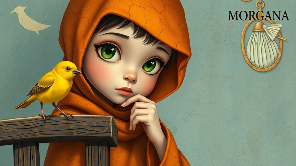 A captivating illustration showcases a young girl with delicate features and large, expressive green eyes. She wears a richly textured, orange-patterned headscarf and a matching cloak with intricate cracks, reminiscent of aged paint. Her chin gently rests on her hand, conveying a reflective demeanor as she observes a tiny, vibrant yellow bird perched on a rustic wooden railing. The backdrop features a subtle, artistic blue-toned textured wall adorned with abstract, faded shapes that echo an ancient mural. The entire scene radiates a whimsical, nostalgic, and fantastical atmosphere, rendered in a soft, painterly style with exquisite details. In the top right corner, the name 'MORGANA' subtly appears, hinting at the origin or creator of the artwork.