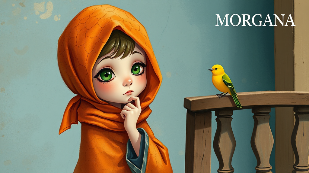 A captivating illustration showcases a young girl with delicate features and large green eyes, her head adorned with a richly textured orange-patterned headscarf and a matching cloak reminiscent of cracked, aged pottery. With her chin resting thoughtfully on her hand, she gazes intently at a brilliant yellow bird perched gracefully on a rustic wooden railing. The background presents a softly muted blue-toned wall, its surface an artistic tapestry of faded, abstract shapes evoking an ancient mural. The scene exudes a magical blend of whimsy and nostalgia, depicted in a fine, soft painterly style. The name 'MORGANA' is elegantly inscribed in the top right corner, possibly signifying the creator or inspiration behind the artwork.