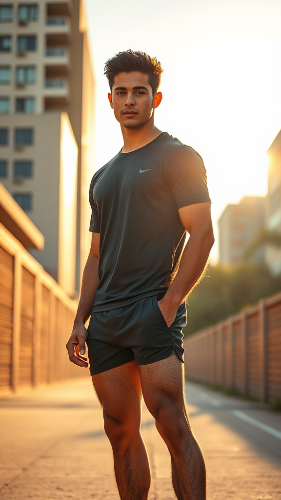 A captivating image captures a young man in an urban landscape during the golden hour. He stands confidently in a T-shirt and revealing shorts, his presence commanding yet approachable. His handsome face embodies the essence of Mexican American and Latino heritage, with features that stand out in perfect symmetry. His athletic build is enhanced by the sunlight, highlighting the definition of his muscles. His short black curly hair glistens under the sun's rays, creating a halo-like effect. The sunlight also caresses his hairy legs, accentuating their natural texture, while his bare feet connect him to the ground. The photograph, reminiscent of an award-winning piece, is shot with a Kodak Portra 800 on a Hasselblad 500C, using a 55mm f/1.8 lens. The image is defined by extreme depth of field, capturing every detail in Ultra HD with high dynamic range and high contrast, producing an 8K masterpiece that embraces the beauty of available light.