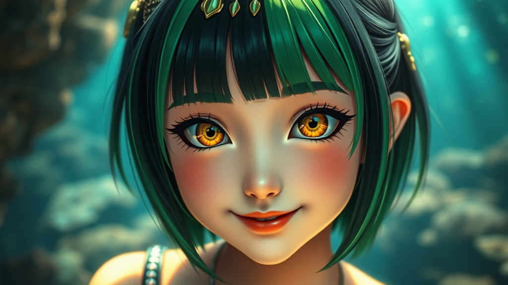 A captivating image featuring a solo girl with two-tone black and green hair styled into blunt bangs and shoulder-length straight hair tucked behind her ear. Her striking yellow eyes are accentuated by black eye shadow and liner, and her cheeks have a subtle blush. She showcases a shy smile with natural-colored lips and perfectly shaped eyebrows. Adorning her forehead is elegant jewelry, enhancing the mystical appeal with mermaid-like scales visible. Her expression is of joy, with a cute head tilt, as she gazes directly at the viewer. The scene unfolds in an enchanting fantasy underwater setting, where vibrant colors illuminate the sea floor in cinematic detail. The composition captures a cowboy body shot, emphasizing the vivacious and high-resolution quality of the image, creating an extraordinary level of detail in this beautiful fantasy art.