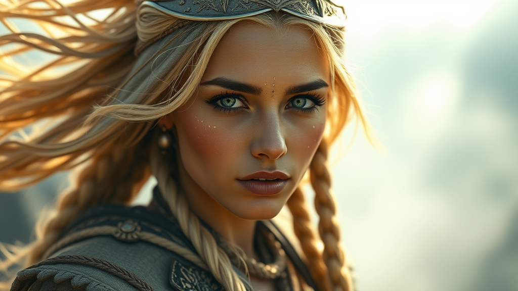 A captivating image of a 25-year-old war princess with flowing, braided blonde hair and cultural face paint, set against a majestic foggy mountain backdrop. The scene, reminiscent of a cinematic film still from the 1980s, is captured with the charm of 35mm film and the grain of a 1950s camera, evoking an analog nostalgic style. Her bright grey eyes are symmetrical and deeply captivating, framed by an alluring expression that conveys both strength and elegance. She is adorned in intricately detailed cloth armor that features an elegant design, blending the realms of urban fantasy with historical allure. Radiant light rays permeate the misty air, casting magical beams that highlight the dust particles and create a heavenly atmosphere. The symmetry extends to the background, enhancing the composition's harmony. The artwork is ultra-realistic, employing highly detailed rendering techniques to emphasize her facial features, skin texture, and clothing. With a natural skin tone and realistic shadows, the image leverages advanced digital painting and rendering software to achieve a photorealistic depiction, all while maintaining an enchanting and inspiring mood.