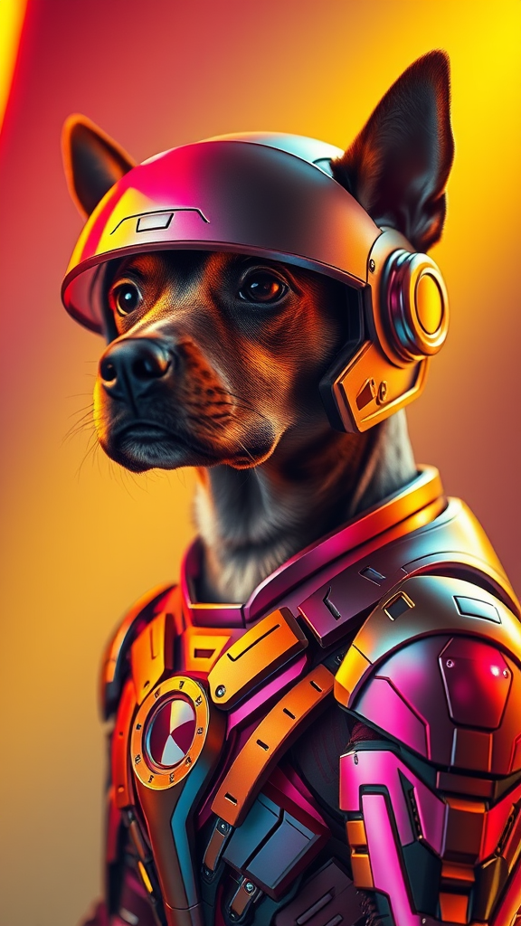 A captivating image of a dog in a cyberpunk-inspired portrait, featuring the animal in an alert pose. The dog is equipped with a sleek bionic helmet and is adorned with armor reminiscent of Iron Man, featuring an elegant blend of golden and chrome plating. The scene is illuminated with contrasting bright red and yellow lights that highlight the intricate details of the armor and create a dynamic backdrop. The dog is depicted in high resolution, showcasing ultra-realistic features and textures. The visual is intended to evoke a sense of realism and focus on the dog's character, with an 8k photorealistic quality. The composition is centered and balanced to emphasize the dog's intriguing fusion of organic and cybernetic elements.