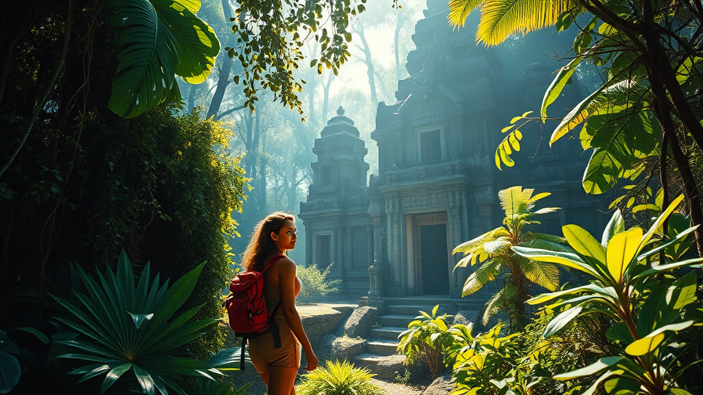 A captivating image of a female explorer stumbling upon an ancient temple ruin nestled deep within the lush jungle, reminiscent of the 1980s adventure era. She stands in awe, bathed in dappled sunlight filtering through the dense canopy, creating a mesmerizing volumetric atmosphere. The central focus of the scene is intricate and highly detailed, capturing the breathtaking beauty of the overgrown temple with vibrant colors and precise linework. The setting exudes a cinematic quality, drawing inspiration from the artistic styles of Carne Griffiths and Conrad Roset. The explorer's expression is one of wonder and discovery, embodying the spirit of adventure amidst the vivid, untouched wilderness. The forgotten structure seems alive with history, surrounded by the rich foliage of the jungle, yet free of any modern distractions or text. The photo radiates an aura of timeless exploration, a journey back to an era of daring quests and hidden mysteries.