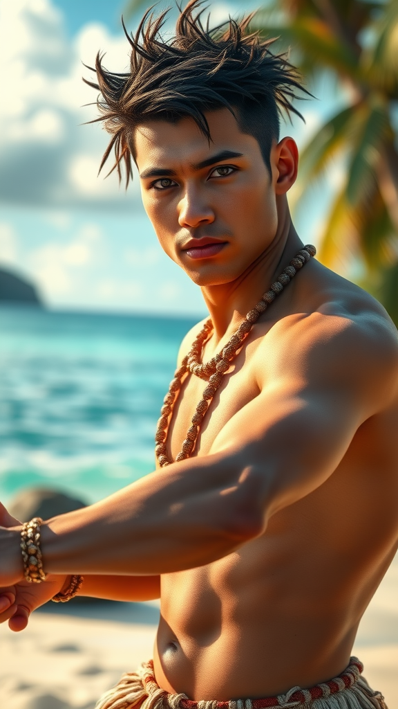 A captivating image of a handsome traditional Polynesian male dancer on a stunning tropical beach, showcasing a youthful, muscular physique; an exquisite face with striking eyes; rendered in a mesmerizing photo-realistic oil painting style by Studio Ghibli and Robert Wyland. The scene is enhanced with dramatic cinematic lighting, akin to a 50mm lens photograph, creating a hyper-realistic, highly detailed, and ethereal atmosphere that beautifully captures the spirit and essence of the moment.