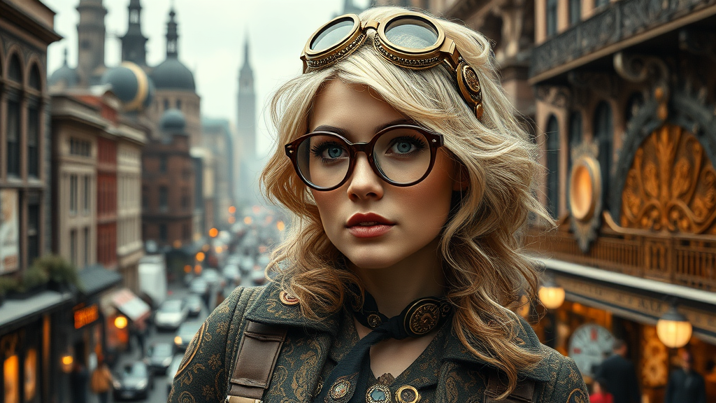 A captivating image of a Steampunk woman with striking blonde hair, wearing intricate round glasses and an adventurer's outfit adorned with Art Deco patterns. Her attire reflects the illustrious style of Jules Verne, perfectly blending with the atmosphere of a bustling Victorian city. The background showcases a cityscape filled with towering, ornate architecture, steam-powered machinery, and bustling streets, all crafted in an extremely detailed and intricate manner. The scene is captured in stunning UHD and HDR quality, revealing every intricacy of the woman's attire and the vibrant surroundings, rendered in breathtaking 16K resolution.