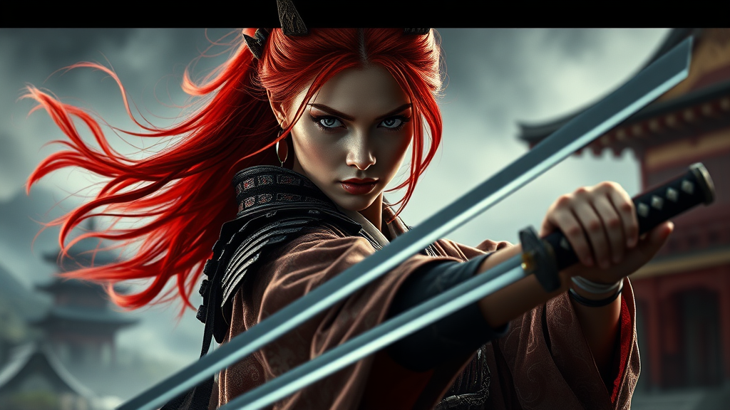 A captivating image of a striking female samurai from the Edo period, her fiery red hair flowing behind her as she stands poised to strike, her piercing gaze filled with intensity. The cinematic lighting casts dramatic shadows, highlighting the intricate details of her traditional armor and elegant kimono. Her katana gleams menacingly in her grasp, capturing the tension of the moment. The background is a blend of misty landscapes and ancient Japanese architecture, enhancing the atmospheric scene.