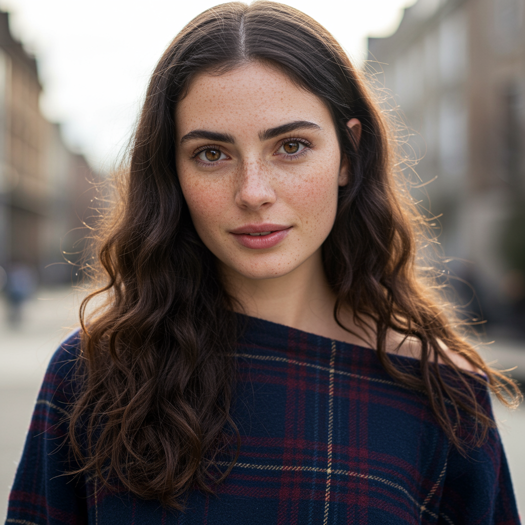 A captivating image of a woman standing with her body facing straight ahead, her head subtly tilted to her left as she gazes directly at the camera with an intriguing blend of confidence and curiosity. Her dark brown, wavy hair cascades over her shoulders, framing her fair skin adorned with a scattering of charming freckles. Her eyes, a rich amber brown, glimmer with a gentle and inviting light. She is adorned in a stylish tartan plaid attire, boasting deep navy blue and rich burgundy with faint gold lines, the neckline playfully draped off her right shoulder. The scene is illuminated with a soft and natural brightness, enhancing the warmth and vitality of her presence.