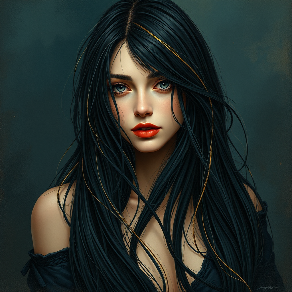 A captivating image of a woman with long black hair intertwined with strands of gold, painted in a style reminiscent of Charlie Bowater. The background is a deep, rich blend of dark blue and black tones, evoking a sense of mystery and elegance. The composition features elements of comic art with a realistic color palette that includes dark blacks and soft beiges, creating a balanced contrast. The image employs soft-focused realism, reminiscent of Michael Garmash's work, resulting in a dreamlike quality that enhances the woman's ethereal presence.