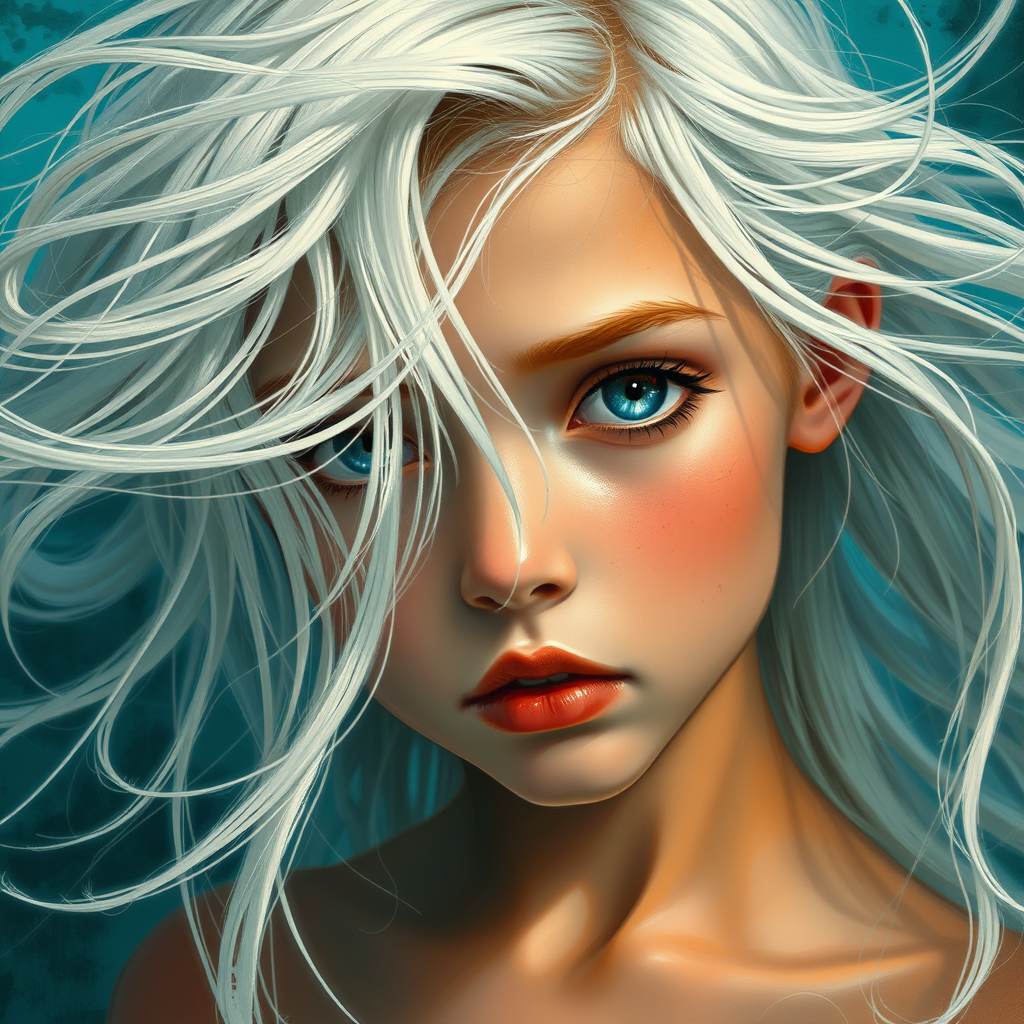 A captivating image of a young girl with flowing white hair, portrayed with a blend of Ross Tran's signature artistic flair and Guido van Helten's detailed realism. Her hair dances around her face, framed by contrasting hues of light teal and dark orange that echo a marine setting. The composition focuses on close-up elements, reminiscent of comic art's dynamism, yet infused with the realism found in traditional marine paintings. This striking imagery invites the viewer into an animated world, where the ethereal subject seems almost alive, enhanced by subtle animated gif-like motion. The scene captures the essence of a dreamlike narrative, balanced between fantasy and reality.