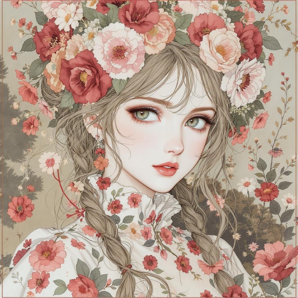 A captivating image of a young woman adorned in a vibrant floral ensemble, reflecting a cottagecore aesthetic with intricate linework in the style of Artgerm. Her facial features are meticulously detailed, exuding a serene yet intense expression. The scene is lush and nature-inspired, bringing a sense of enchantment and closeness to nature. The colors are rich and harmonious, blending soft pastels with earthy tones, while the flowers vary in shape and size, forming an organic yet elegant pattern. Her eyes, filled with wonder and depth, are the focal point, drawing the viewer into her whimsical world.