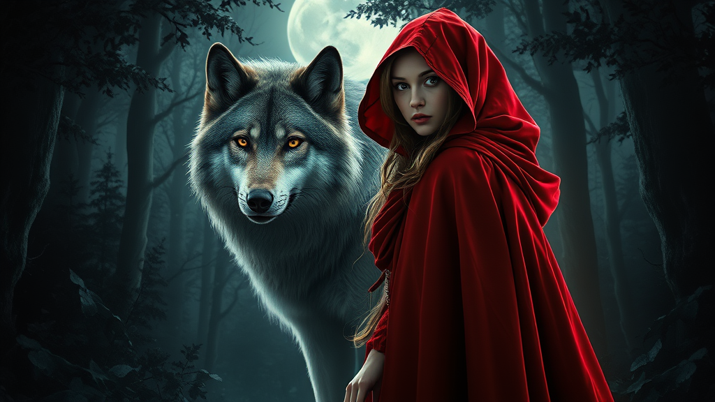 A captivating image of a young woman in a scarlet cape standing beside a majestic wolf amidst the shadows of an enigmatic forest, stunning photorealism captures the interplay of dappled moonlight and dark foliage, subtle hints of mystery and companionship, intricate details reveal her determined gaze and the wolf's watchful eyes, a seamless blend of digital painting and art photography that evokes a sense of wonder in this surreal woodland scene.