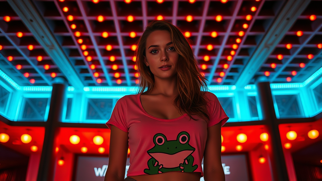 A captivating image of an alluring woman wearing a stylish Frog-themed cropped t-shirt, standing confidently in front of the iconic Watergate complex. The ceiling above is adorned with a striking arrangement of intense red lights in a grid pattern, creating an atmospheric contrast with the cool blue accents that line the walls and support beams. The setting radiates a moody, nightlife ambiance, enhanced by subtle shadows and highlights that play across her figure, emphasizing a full-body perspective and drawing the viewer into a scene that feels both cinematic and intriguing.