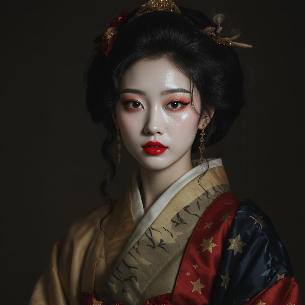 A captivating image of an Asian woman with beautifully curled hair, captured in the style of a Samyang AF 14mm f/2.8 RF lens. Her distinct facial features are highlighted with a hyper-realistic sheen akin to the texture of water. She is dressed in an ensemble that blends the eccentricity of Oshare Kei with the earthy tones of Mori Kei, all set against a dark beige backdrop. Influences from Hallyu fashion are subtly woven into her attire, creating a harmonious yet striking fusion. The aspect ratio is slightly elongated, enhancing the ethereal quality of the scene. The overall style is highly artistic and magnifies the beauty of intricate details.