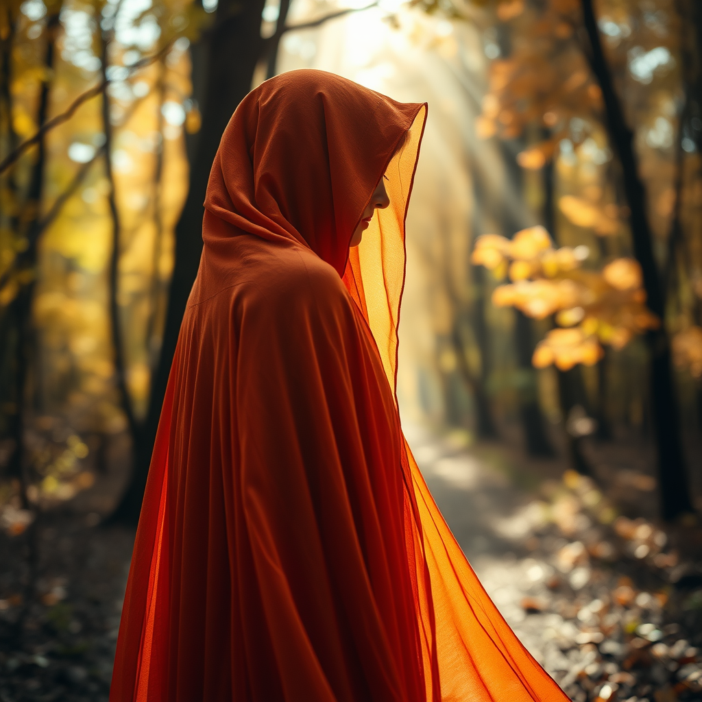 A captivating image of an enigmatic woman draped in a flowing orange veil cloak, wandering through a serene autumn forest. The photograph captures intricate details with a professional touch, showcasing a high-resolution, lifelike quality. The scene is set from a cinematic angle, highlighting dynamic sunlight streaming through the trees, casting an ethereal glow. A soft bokeh effect enhances the background, emphasizing the woman's mysterious presence amidst the fall foliage.