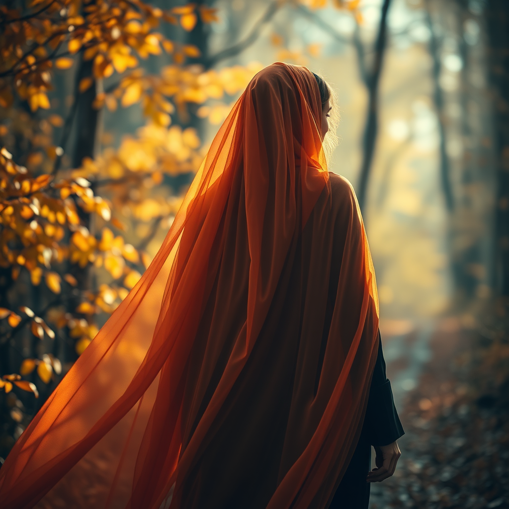 A captivating image of an enigmatic woman draped in a flowing orange veil cloak, meandering through a serene autumn forest, with leaves ablaze in fall hues, captured in exquisite detail and dramatic focus. The photograph embodies the essence of high-resolution realism, with a cinematic angle that enhances the ethereal atmosphere. Dynamic backlighting bathes the scene, casting a warm glow that contrasts with the cool forest shadows, and the background subtly fades into a soft bokeh, emphasizing the subject’s graceful mystery.
