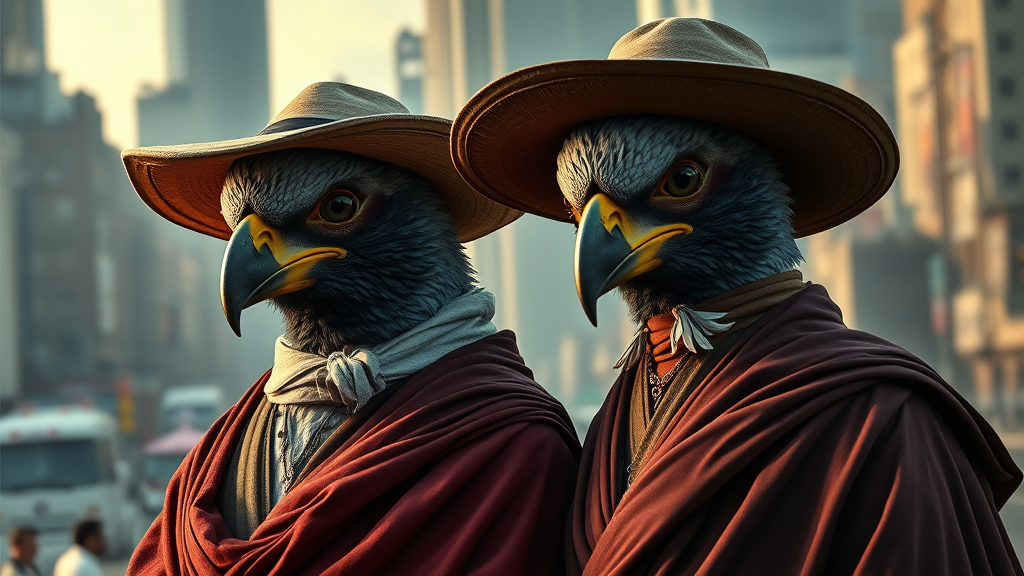 A captivating image of two individuals, adorned in elegant cloth hats and flowing robes, brought to life in the style of realistic animal portraits, rendered with the stunning realism of Unreal Engine. The scene exudes a neo-renaissance flair, bathed in the rich, harmonious colors of maroon and emerald. The characters are enshrined in an avian-themed setting, their features reflecting the intricate beauty of birds, captured against the backdrop of a bustling cityscape. These charming personas emanate a sense of whimsy and grace, inviting the viewer into a world where nature and urban life seamlessly intertwine.