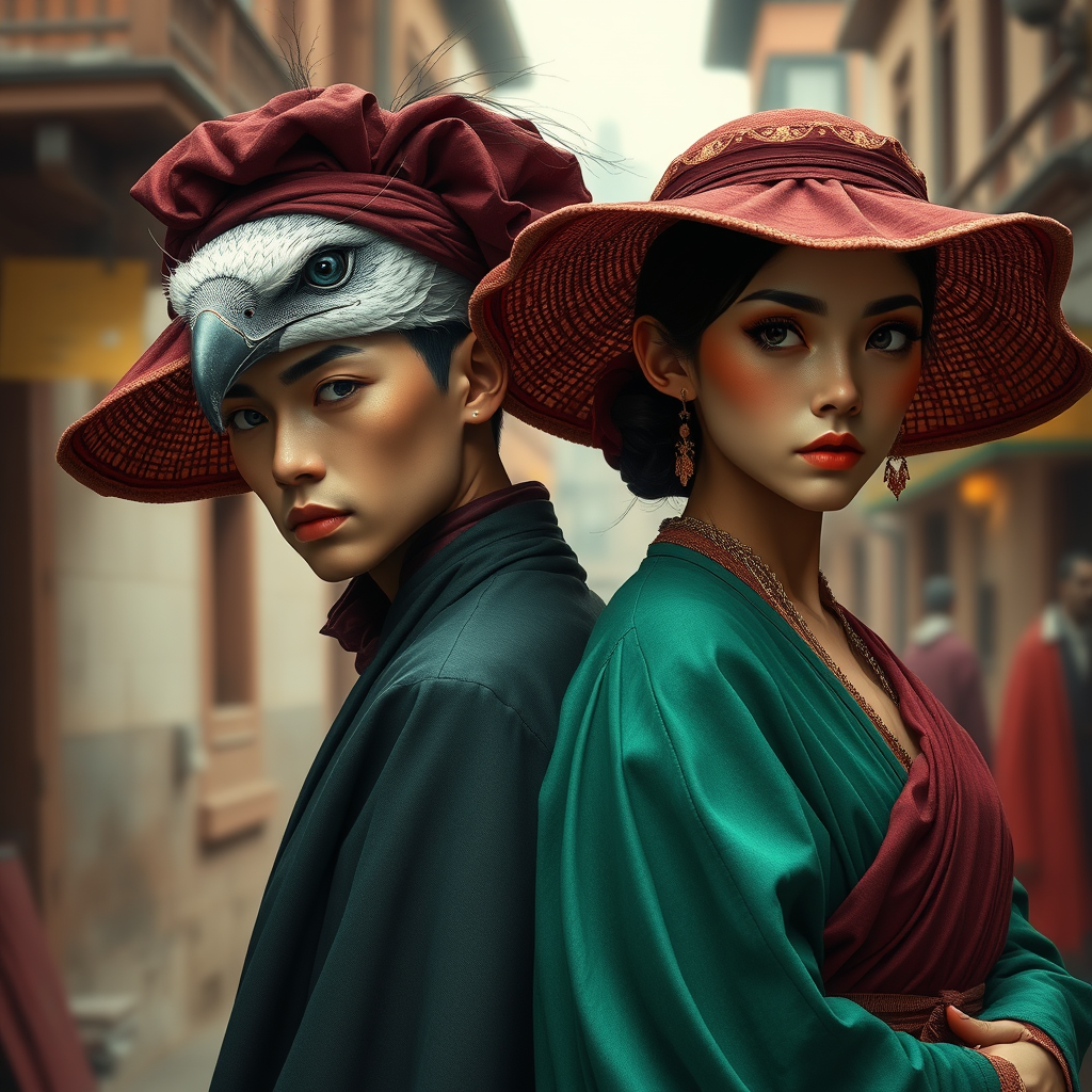 A captivating image of two individuals, donned in cloth hats and flowing robes reminiscent of realistic animal portraits, captured in the sophisticated style of Unreal Engine. Drawing inspiration from the Neo-Renaissance era, with a color palette of rich maroon and vibrant emerald, infused with avian-themed elements. Set against a backdrop that evokes the charm of cityscapes, these characters exude an enchanting presence.