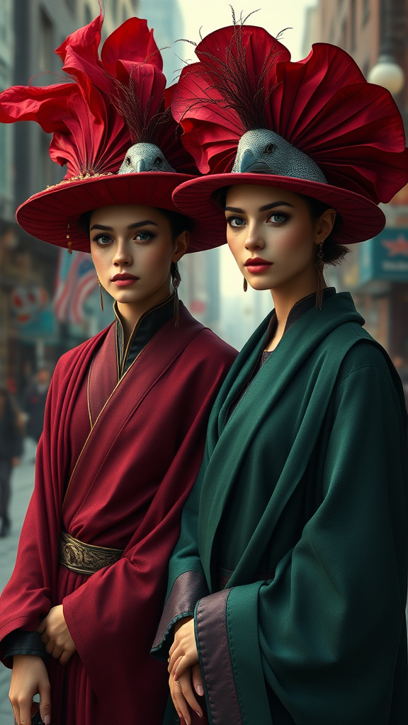 A captivating image of two individuals donned in elaborate cloth hats and flowing robes, depicted in the style of lifelike animal portraits, designed with the realism of Unreal Engine and capturing the essence of a neo-renaissance aesthetic. The color palette is a rich fusion of maroon and emerald hues, with avian-themed elements subtly woven into their attire. Set against a bustling cityscape backdrop, the portrait exudes charm and character, presenting these figures as enigmatic and enchanting personalities amidst an urban tapestry.