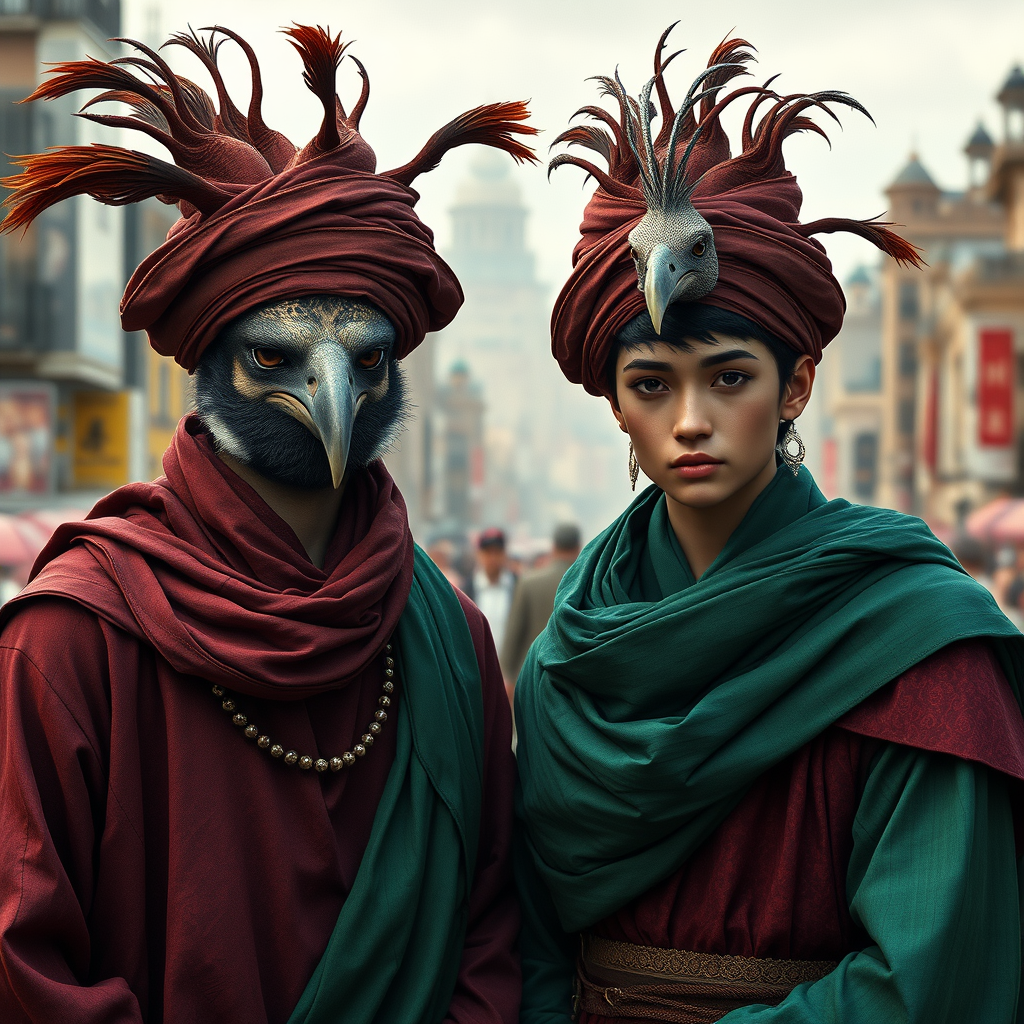 A captivating image of two individuals, donned in intricate cloth hats and flowing robes, embodying realistic animal portraiture in a neo-renaissance style; their attire is richly hued in maroon and emerald, subtly reflecting an avian theme. The scene is set against a backdrop of a bustling cityscape, each character exuding a unique charm, rendered with the precision and detail reminiscent of an Unreal Engine creation.
