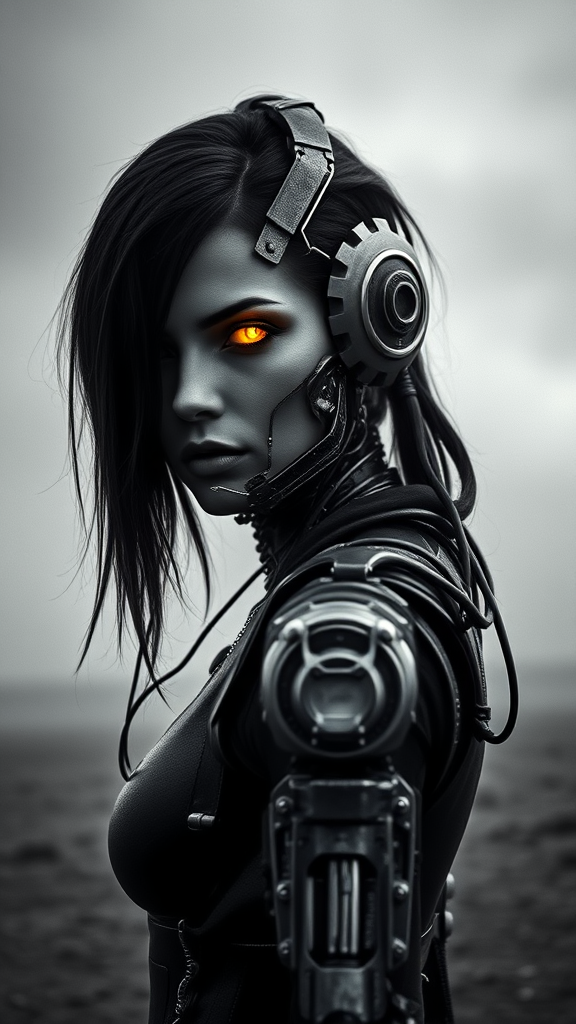 A captivating image portraying the enigmatic allure of the Terminator Girl, her cyborg features partially hidden in shadow as she stands resolute against a barren, windswept landscape. Her luminous yellow eye shines vividly in the murk. Shot with a Canon L Series 70-200mm f/2.8 lens, ISO 1600, in a monochrome futuristic style, evoking a sense of mystery and intrigue. The stark contrast between the metallic elements and the soft human aspects creates a dynamic tension, while the elongated composition accentuates her imposing presence against the vast, empty backdrop.