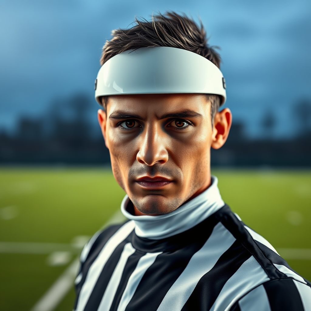 A captivating individual dressed as a football referee stands confidently on a football field, centered and gazing directly at the viewer. The portrait captures detailed, realistic skin textures and exhibits a photo-realistic quality in 8k resolution. The image features a full-length frame with high-detail RAW color art, employing diffused soft lighting and a shallow depth of field for sharp focus. The scene exudes hyperrealism with cinematic lighting, resembling CGI and 3d elements, ensuring that it emphasizes the character's presence. The football field background complements the subject, providing context without distraction. The image is generated with an artistic touch, avoiding any low-quality elements or imperfections, ensuring anatomical accuracy and realistic proportions. There are no digital artifacts or distortions, maintaining overall harmony and visual appeal.