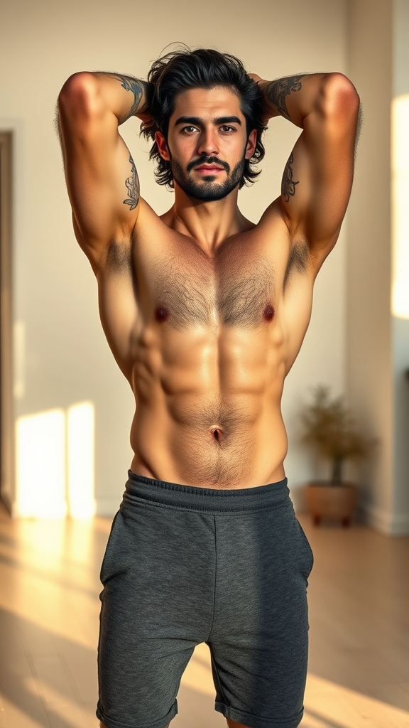 A captivating Italian man with dark, wavy hair and a strikingly hairy chest stands confidently with his arms raised, revealing underarm hair and showcasing his sculpted abs. He wears form-fitting charcoal gray shorts that accentuate his fit physique. Intricate tattoos adorn his muscular arms. He is posed in a spacious, minimalist room with pristine white walls, bathed in the warm, golden light of late afternoon. The image, captured in a raw and unfiltered style, emanates an authentic charm reminiscent of a spontaneous moment shared on social media in 2018.