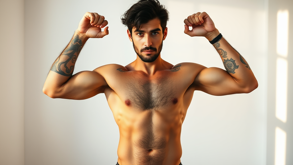 A captivating Italian man with tousled dark hair, showcasing his strikingly hairy chest, stands confidently with his arms raised, revealing his natural underarm hair. His well-defined abs and fit physique are highlighted by snug charcoal gray shorts. He is in a minimalist room with pristine white walls, adorned with tattoos that grace his arms. The entire scene is bathed in the soft glow of the golden hour, capturing the raw essence of his strong presence, reminiscent of a post on social media from 2018.