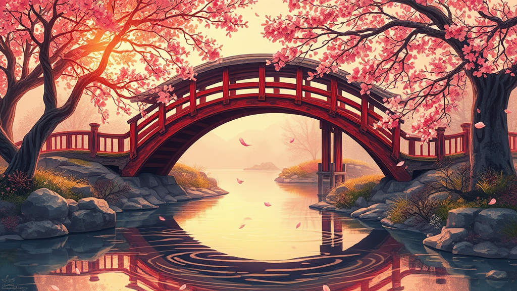 A captivating Japan traditional art style illustration depicting a weathered red wooden bridge gracefully arching over a gently winding stream. The scene is drenched in the warm, ethereal glow of the golden hour, as sunlight filters through an abstract canopy of stylized trees whose leaves whisper ancient secrets. The bridge, a testament to time's passage, is surrounded by an aura of nostalgia, yet resonates with an unexpected contemporary vibrancy. Soft reflections ripple across the water, creating a dreamy mirror that dances with the colors of dawn and the subtle movements of nature. In the distance, cherry blossom petals drift lazily through the air, adding a poetic touch to this timeless moment. The artwork, framed in a wide 16:9 aspect ratio, evokes a serene and harmonious blend of past and present, inviting the viewer to immerse themselves in its tranquil beauty.