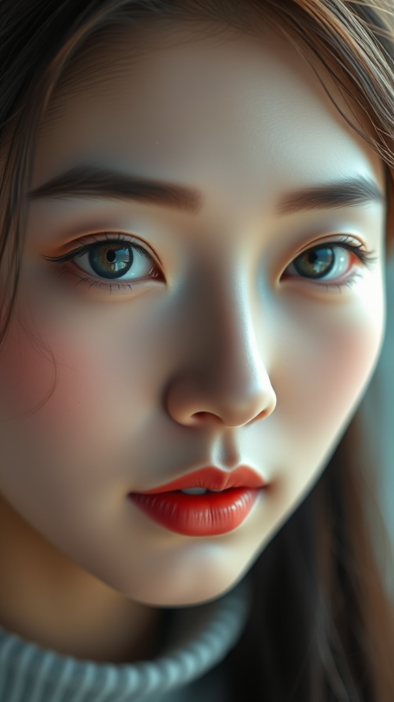 A captivating Korean woman, embodying the grace of a K-pop idol, with perfectly symmetrical eyes. The image is an ultra high-resolution, photorealistic 8k masterpiece, capturing hyperrealistic details through dramatic lighting, akin to the finest photography. Utilizing physics-based rendering techniques, the composition boasts exceptional quality and high detail, showcased in a professional close-up photograph. Her beautiful, detailed eyes are mesmerizing, with influences from the ulzzang-6500-v1 aesthetic. This RAW color photo highlights her flawless features, avoiding any digital art pitfalls such as low resolution or imperfections. The artistry ensures no distracting elements like text, logos, or deformed features. Her proportions are impeccable, with no added limbs or anomalies, delivering a sublime visual experience that retains its harmony and allure.