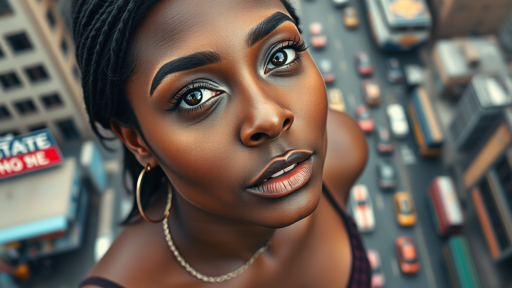 A captivating masterpiece of a woman with enchanting big brown eyes and rich, dark skin, posed with her whole body at a high angle. Her complex posture shows a closed navel and serene expression, as her eyes gaze upwards, revealing extremely detailed features. A bustling cityscape forms the backdrop, captured through the lens of a Nikon D850 with a Kodak Portra 400 film aesthetic, f1.6 aperture lens. The image is imbued with hyperrealistic textures and vibrant, rich colors that bring the scene to life.